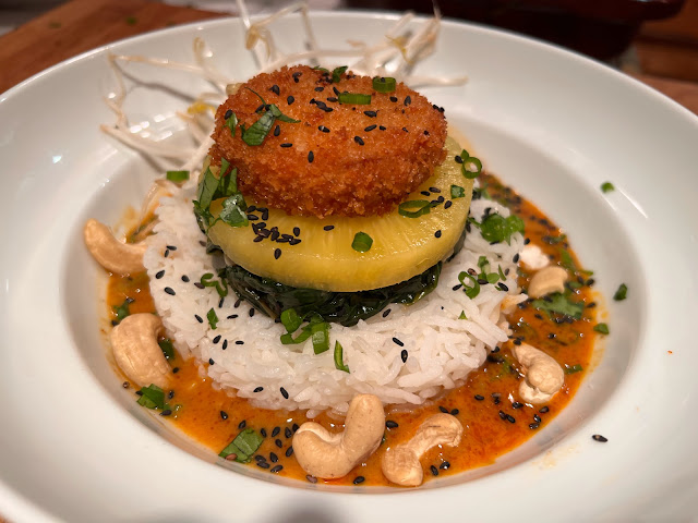 Plating- I used molds to keep the shape and look pretty. I used Jasmine Rice. Stack them: Rice, Spinach, Pineapple Slice (Alternatively, you could fry them too), Medallion. Add the